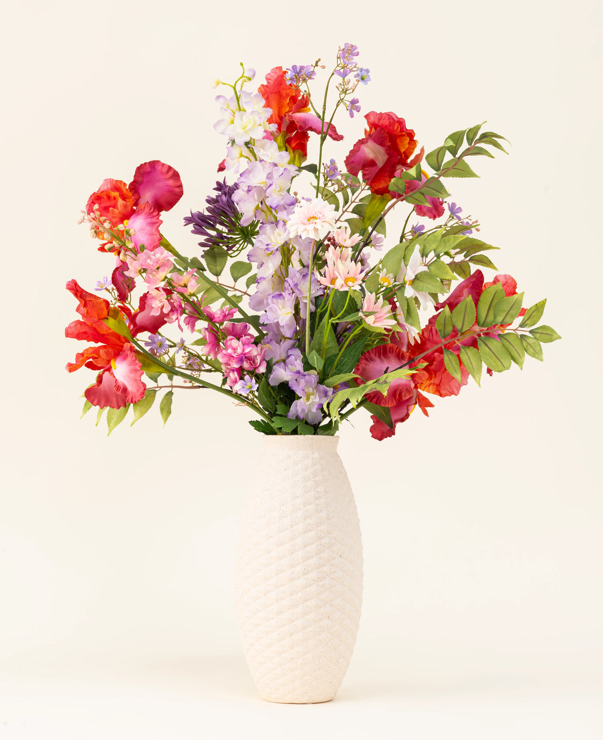 De rode iris en paarse delphinium zorgen voor hoogte en intensiteit, terwijl de roze madelief en zachte gerbera mini een luchtige charme toevoegen....