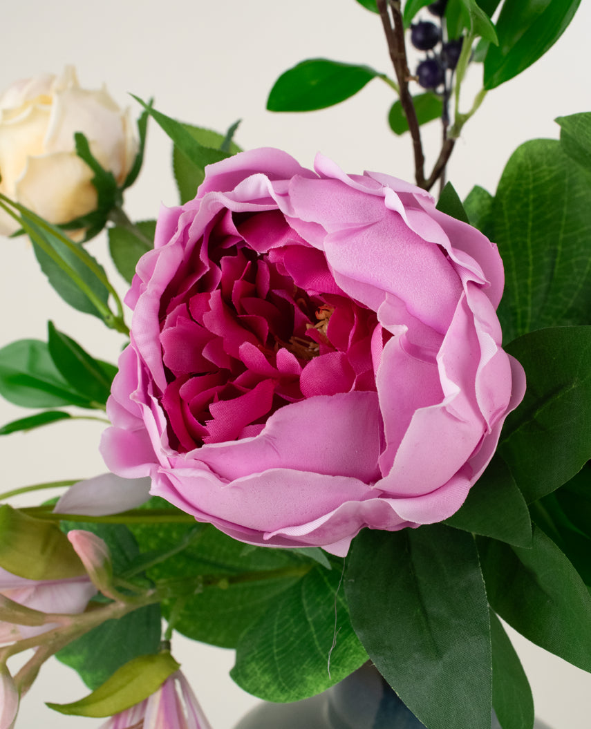 De diep paarse Lotus Pioenroos vormt een prachtig contrast met de lichtroze Rhododendron en Sedumtak, terwijl de elegante Pioenroos en Anemoon in zachte tinten zorgen voor een tijdloze charme. De speelse Berrytak, frisse Aster en luchtige accenten van...